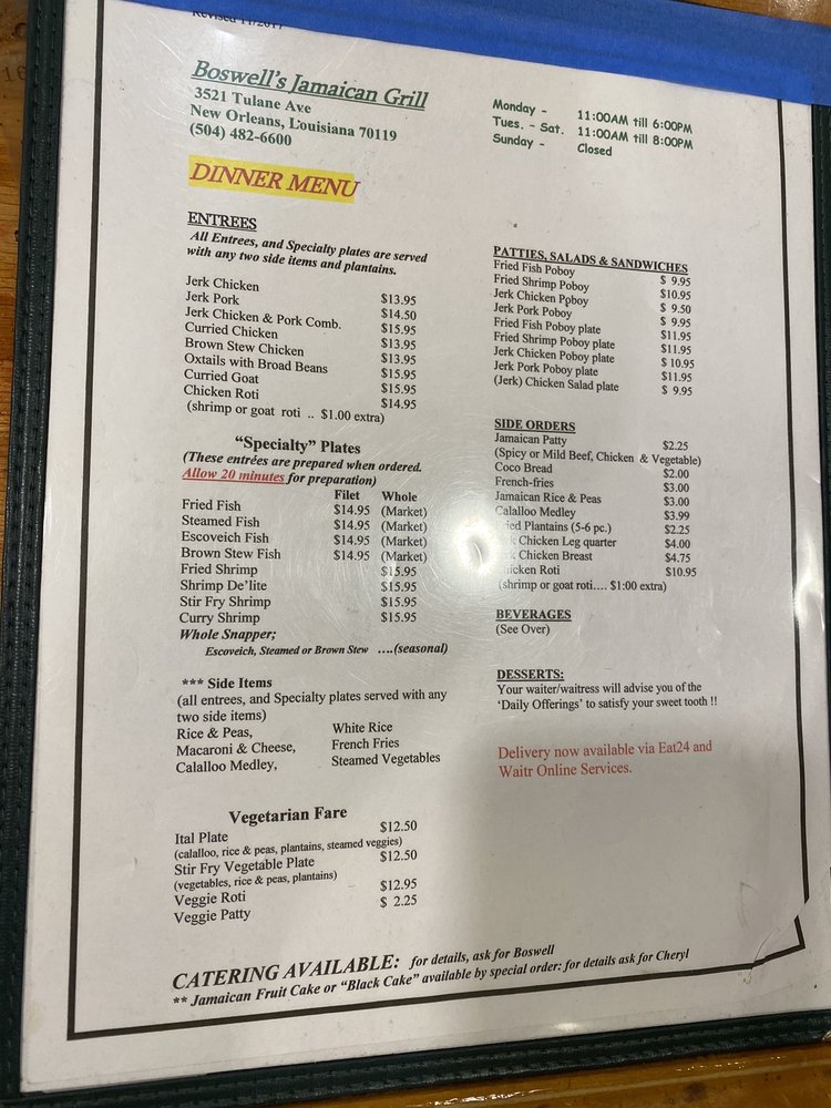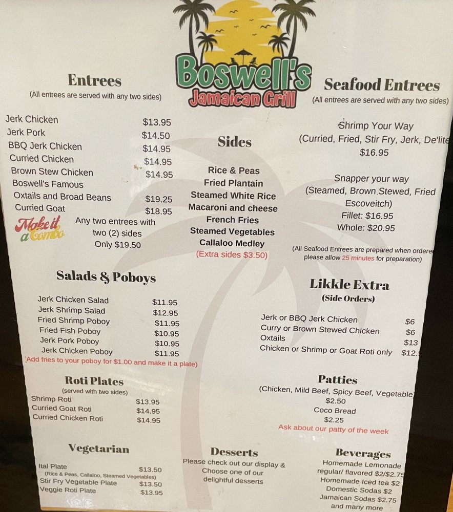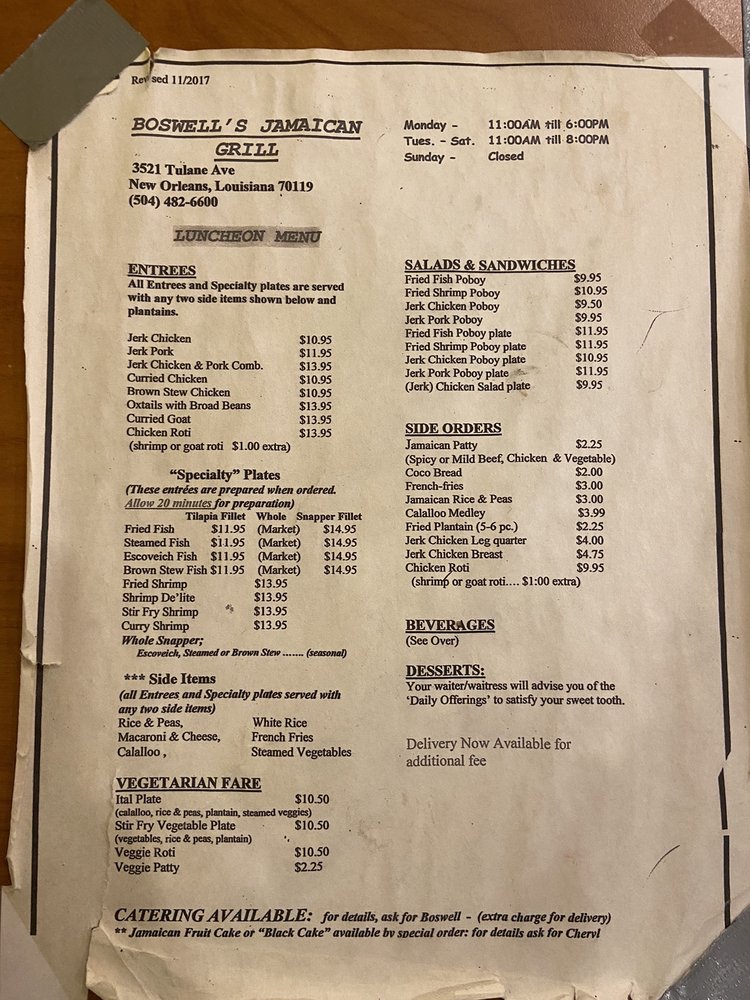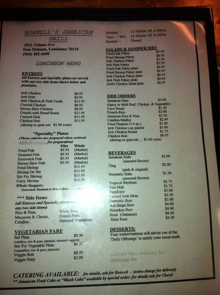 Introducing Boswell's Jamaican Grill: Located in New Orleans, Boswell's Jamaican Grill offers a diverse menu of authentic Jamaican cuisine with a modern twist. From flavorful Jerk Chicken and Jerk Pork to mouthwatering Oxtails and Roti, the entrees are a true delight for the taste buds. The menu also features a variety of salads and Poboys, including the popular Fried Fish Poboy Sandwich and Jerk Chicken Salad Plate. Customers rave about the friendly and attentive staff, cozy ambiance, and generous portion sizes. With a commitment to serving high-quality cuisine, Boswell's Jamaican Grill caters to all dietary needs, including vegetarian options like delicious vegetable patties. Experience the vibrant flavors and warm hospitality of Jamaica at Boswell's Jamaican Grill today.