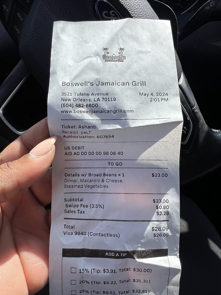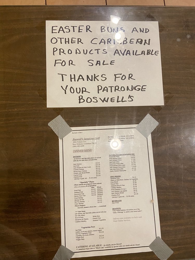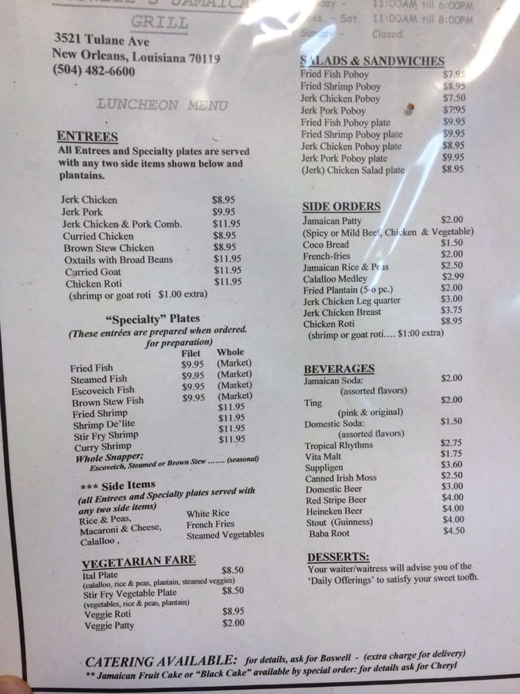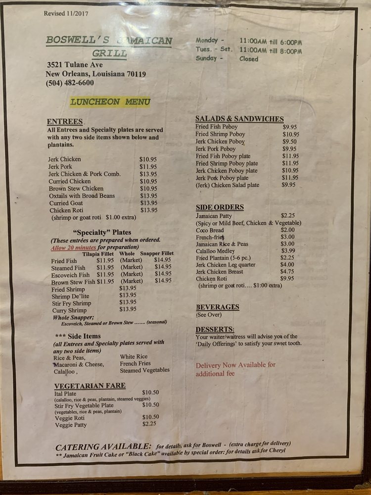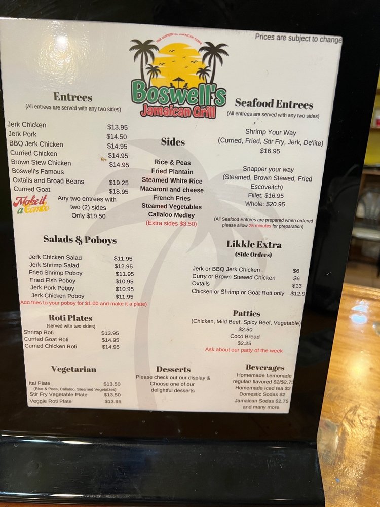 Introducing Boswell's Jamaican Grill: Located in New Orleans, Boswell's Jamaican Grill offers a diverse menu of authentic Jamaican cuisine with a modern twist. From flavorful Jerk Chicken and Jerk Pork to mouthwatering Oxtails and Roti, the entrees are a true delight for the taste buds. The menu also features a variety of salads and Poboys, including the popular Fried Fish Poboy Sandwich and Jerk Chicken Salad Plate. Customers rave about the friendly and attentive staff, cozy ambiance, and generous portion sizes. With a commitment to serving high-quality cuisine, Boswell's Jamaican Grill caters to all dietary needs, including vegetarian options like delicious vegetable patties. Experience the vibrant flavors and warm hospitality of Jamaica at Boswell's Jamaican Grill today.